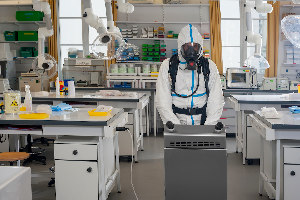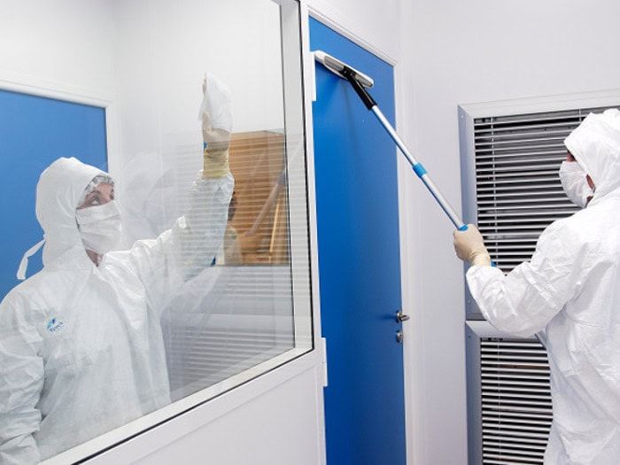 Nettoyage spécifique des salles blanches, hottes, paillasses et équipements de laboratoire avec produits adaptés.